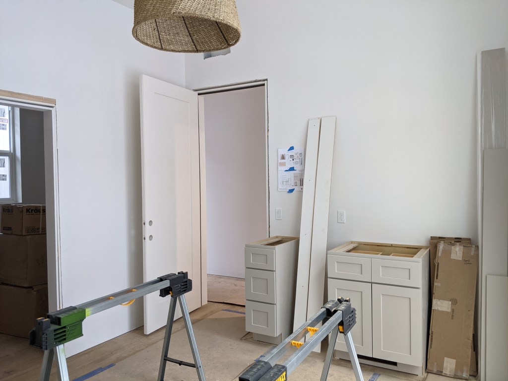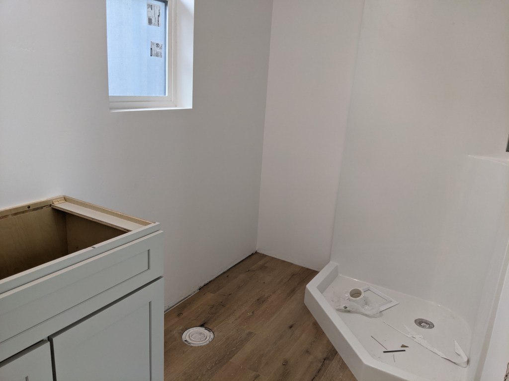 From the outside, the guest house looks just about done, we are waitin on the metel and glass railing. But on the inside we are only waiting on the counters to be installed. The rest is here and ready to go in. Here is an update picture. So Cabinets are in, floors are in, and the shower is in. Next is the counters, then sinks, toilet, closets, faucets, appliances, 1 door and a light. Oh and hardware. We are close. Will be ready for booking this beautiful guest house March 1st.